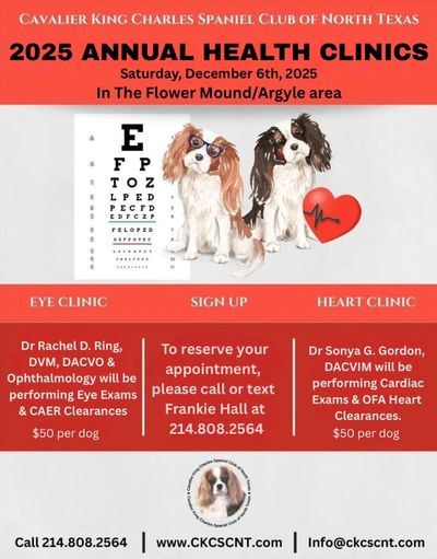 Please call or text Frankie Hall at (214)808-2564 to reserve your spot. If texting, please include your phone number, email, number of Cavaliers and specify heart, eyes or both to be tested.